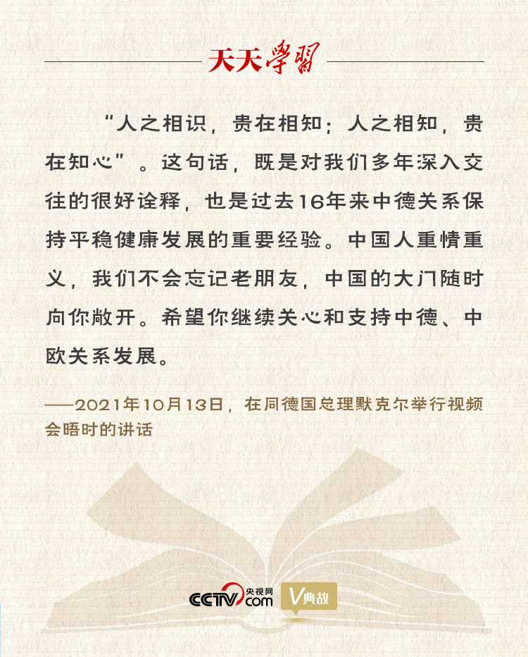 天天學(xué)習(xí)10月13日,習(xí)近平主席同德國總理默克爾舉行視頻會(huì)晤。雙方在友好的氛圍中回顧近年中德、中歐關(guān)系發(fā)展并就相關(guān)問題深入交換意見。習(xí)主席積極評(píng)價(jià)默克爾任內(nèi)為推動(dòng)中德、中歐關(guān)系發(fā)展所作的貢獻(xiàn),并引用“人之相識(shí),貴在相知;人之相知,貴在知心”,稱這句話“既是對(duì)我們多年深入交往的很好詮釋,也是過去16年來中德關(guān)系保持平穩(wěn)健康發(fā)展的重要經(jīng)驗(yàn)”。