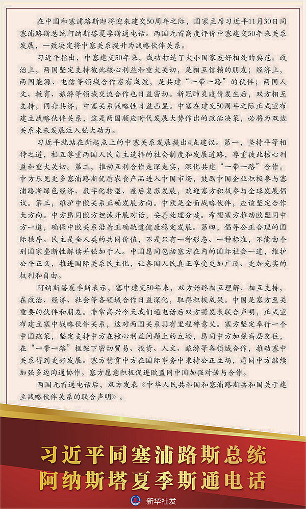 新華社北京11月30日電 在中國(guó)和塞浦路斯即將迎來(lái)建交50周年之際,國(guó)家主席習(xí)近平11月30日同塞浦路斯總統(tǒng)阿納斯塔夏季斯通電話(huà)。兩國(guó)元首高度評(píng)價(jià)中塞建交50年來(lái)關(guān)系發(fā)展,一致決定將中塞關(guān)系提升為戰(zhàn)略伙伴關(guān)系。