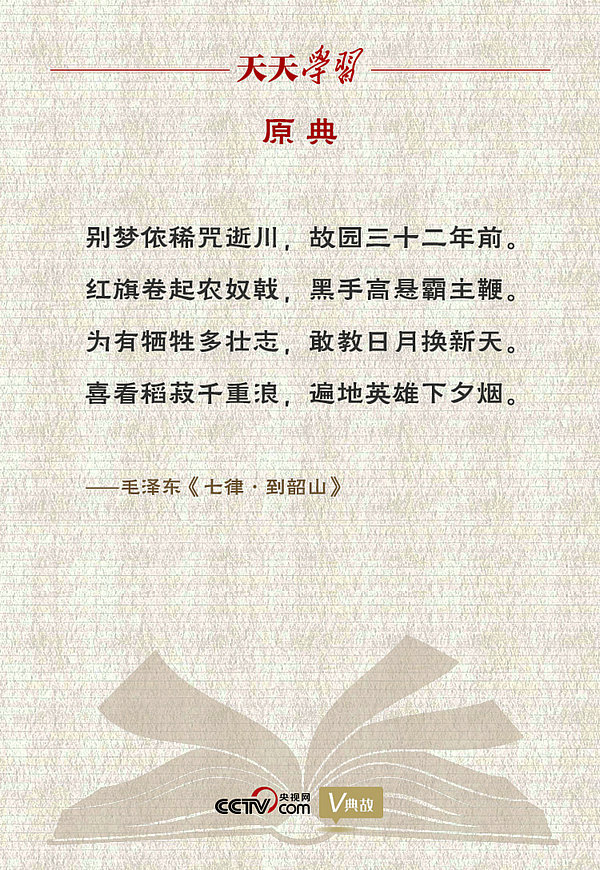 尾聯(lián)“喜看稻菽千重浪,遍地英雄下夕煙”,形象地描繪了故鄉(xiāng)舊貌換新顏的景象,生動感人。詩人從歷史的萬千追憶中回到現(xiàn)實,喜見韶山?jīng)_稻浪滾滾,豐收在望,人民戰(zhàn)天斗地,建設(shè)國家,這是革命先烈“換新天”理想的實現(xiàn),也是對革命先烈最好的告慰。