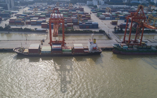 2021年6月3日,集裝箱貨輪??吭谥袊?guó)(福建)自由貿(mào)易試驗(yàn)區(qū)福州青州集裝箱碼頭(無人機(jī)照片)。新華社記者 宋為偉 攝