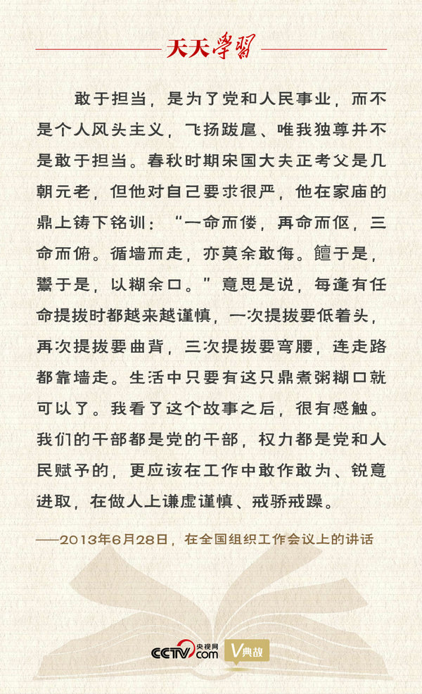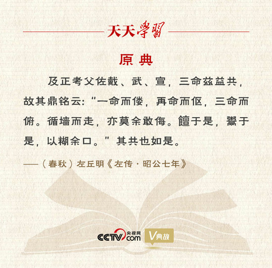上面這條典故文字佶屈聱牙,習(xí)近平總書記在引用時進(jìn)行了生動通俗的闡釋,告誡黨員領(lǐng)導(dǎo)干部要像正考父一樣嚴(yán)格要求自己,把位置放低,少些自滿,多些干勁。