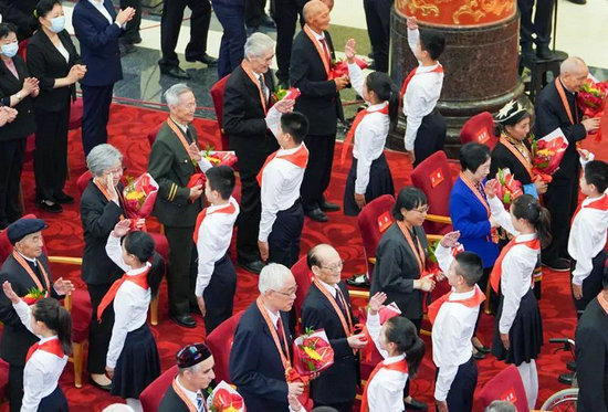 ▲2021年6月29日,“七一勛章”頒授儀式在人民大會(huì)堂隆重舉行。少先隊(duì)員向勛章獲得者獻(xiàn)花,敬禮致意。