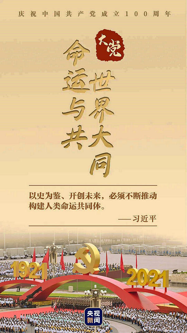 “以史為鑒、開創(chuàng)未來,必須不斷推動(dòng)構(gòu)建人類命運(yùn)共同體。”習(xí)近平總書記在慶祝中國共產(chǎn)黨成立100周年大會(huì)上給出明確答案。