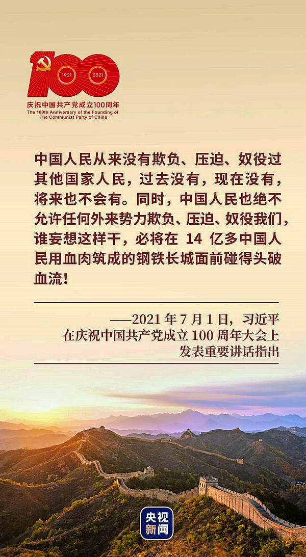百年歷史長河中,中國共產(chǎn)黨帶領(lǐng)中國人民推翻帝國主義、封建主義、官僚資本主義三座大山,戰(zhàn)勝帝國主義、霸權(quán)主義的顛覆破壞和武裝挑釁。無論時(shí)代如何發(fā)展,我們都要砥礪不畏強(qiáng)暴、反抗強(qiáng)權(quán)的民族風(fēng)骨。