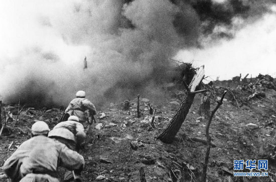 1952年,在上甘嶺戰(zhàn)役中,中國人民志愿軍指戰(zhàn)員在炮火支援下,攻上537.7高地北山。新華社發(fā)