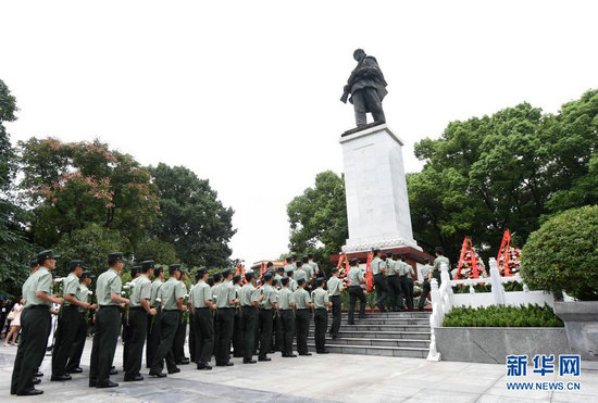 在位于重慶市銅梁區(qū)的邱少云烈士紀(jì)念館,武警官兵向邱少云烈士紀(jì)念碑獻(xiàn)花(2017年9月30日攝)。新華社記者 唐奕 攝