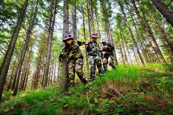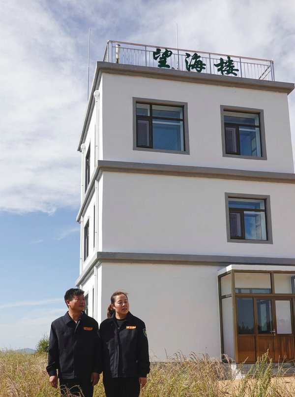 ↑護(hù)林員劉軍(左)、王娟在塞罕壩機(jī)械林場(chǎng)望海樓前(2021年8月23日攝)。在13年的堅(jiān)守中,劉軍、王娟夫婦用常人難以想象的辛勤付出守護(hù)林場(chǎng)安全。