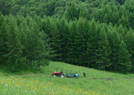 ↑工人在塞罕壩機(jī)械林場(chǎng)千層板林場(chǎng)內(nèi)運(yùn)輸苗木(2013年7月11日攝)。