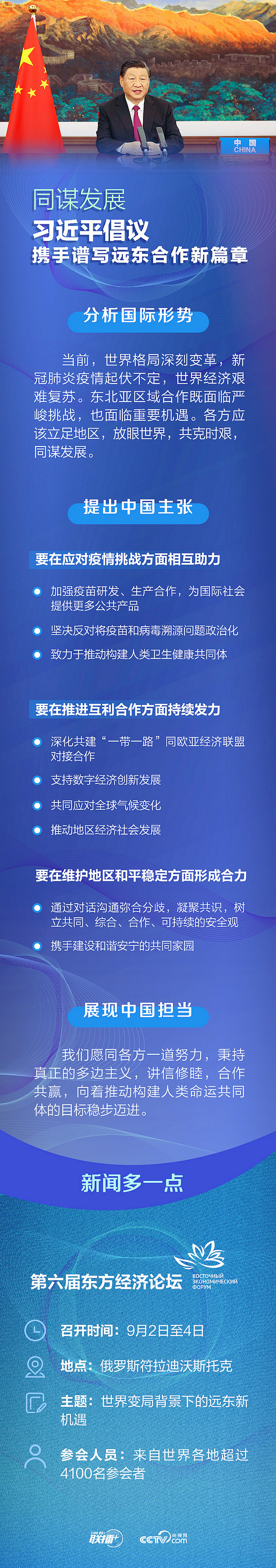 9月3日,習(xí)近平主席應(yīng)邀以視頻方式出席第六屆東方經(jīng)濟論壇全會開幕式并發(fā)表題為《共克時艱,同謀發(fā)展 攜手譜寫遠東合作新篇章》的致辭。