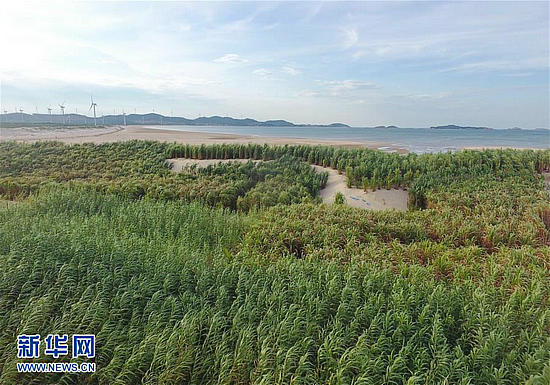 這是福建省平潭綜合實驗區(qū)一處沙灘上栽種的用于防風固沙的菌草(2019年7月25日無人機拍攝)。新華社記者 林善傳 攝