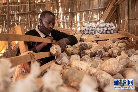 2020年9月9日,在盧旺達首都基加利,食用菌培育作坊主人埃馬紐埃爾·阿希馬納檢查菌袋。新華社發(fā)(西里爾·恩德格亞攝)
