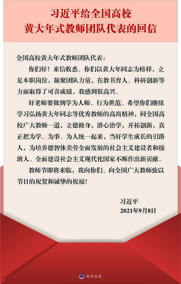 人民網(wǎng)北京9月13日電 (記者孫競(jìng)、郝孟佳、熊旭、李依環(huán)、溫璐)在第三十七個(gè)教師節(jié)來臨之際,中共中央總書記、國(guó)家主席、中央軍委主席習(xí)近平9月8日給全國(guó)高校黃大年式教師團(tuán)隊(duì)代表回信,對(duì)他們寄予殷切期望,并向全國(guó)廣大教師致以節(jié)日的祝賀和誠(chéng)摯的祝福。