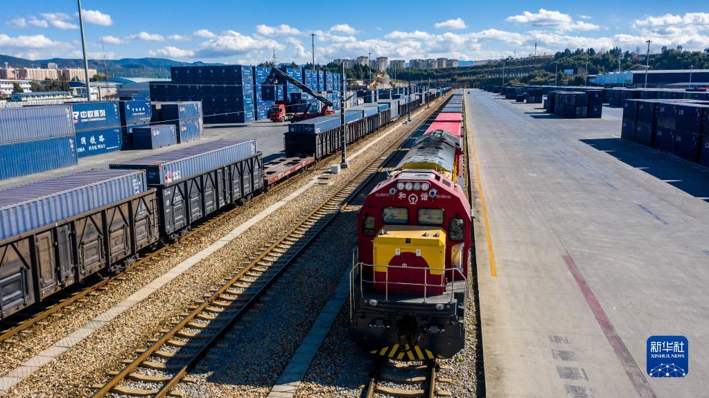 2022年1月1日,滿載30個標準集裝箱的中老鐵路新年首趟國際貨物列車??吭谥需F聯(lián)集昆明中心站(無人機照片)。新華社記者 胡超 攝