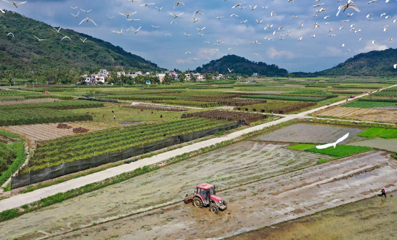 ↑海南省陵水黎族自治縣光坡鎮(zhèn)的農(nóng)民在田間勞作(2021年4月5日攝,無人機照片)。