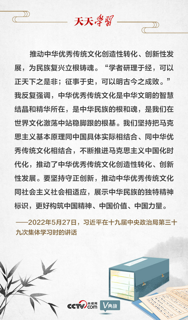 5月27日,中央政治局就深化中華文明探源工程進(jìn)行第三十九次集體學(xué)習(xí)。習(xí)近平總書(shū)記在主持學(xué)習(xí)時(shí)強(qiáng)調(diào),中華文明源遠(yuǎn)流長(zhǎng)、博大精深,是中華民族獨(dú)特的精神標(biāo)識(shí),是當(dāng)代中國(guó)文化的根基,是維系全世界華人的精神紐帶,也是中國(guó)文化創(chuàng)新的寶藏。他引用古語(yǔ)“學(xué)者研理于經(jīng),可以正天下之是非;征事于史,可以明古今之成敗”,強(qiáng)調(diào)要推動(dòng)中華優(yōu)秀傳統(tǒng)文化創(chuàng)造性轉(zhuǎn)化、創(chuàng)新性發(fā)展,為民族復(fù)興立根鑄魂。