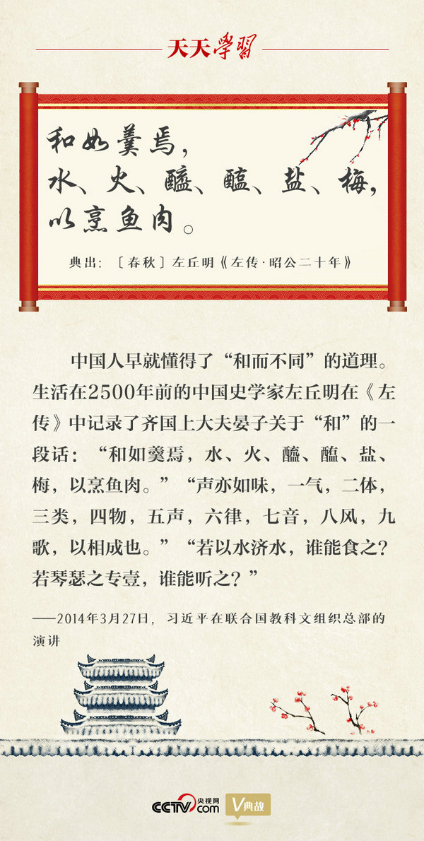 2014年3月27日,在聯(lián)合國教科文組織總部的演講中,習近平主席激情洋溢地闡述了中國“和而不同”的理念,并用“和如羹焉,水、火、醯、醢、鹽、梅,以烹魚肉”,說明中國人早在2500年前就懂得了“和而不同”的道理。
