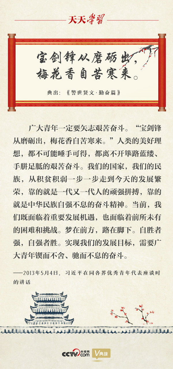 2013年5月4日,習近平總書記在同各界優(yōu)秀青年代表座談時,用“寶劍鋒從磨礪出,梅花香自苦寒來”勉勵廣大青年練就過硬本領(lǐng),矢志艱苦奮斗,用勤勞的雙手、一流的業(yè)績成就屬于自己的人生精彩。以典喻理,寄意深遠。