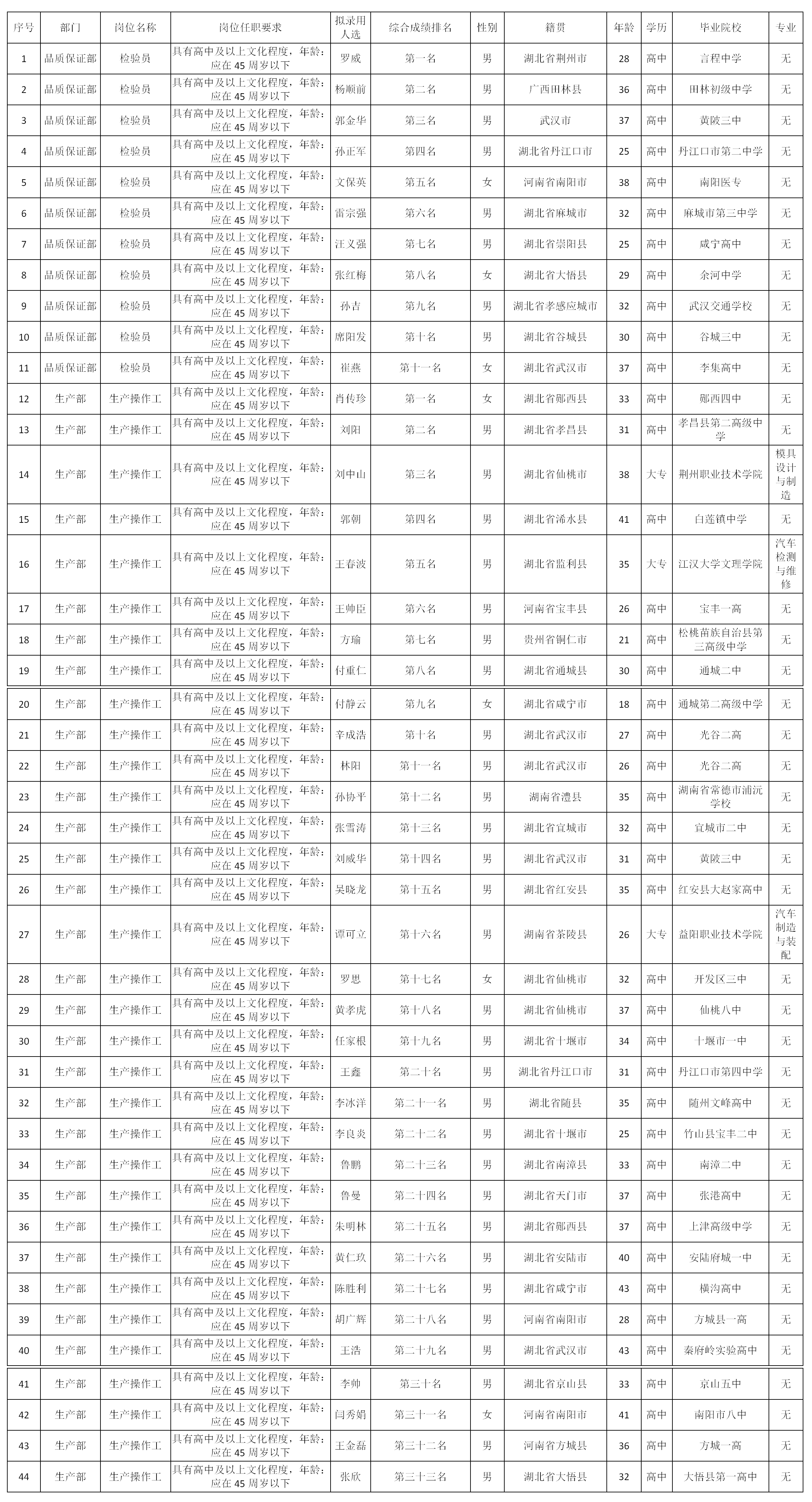 根據(jù)四川波鴻實業(yè)有限公司發(fā)布的招聘公告及招聘相關(guān)規(guī)定,經(jīng)面試、體檢等程序,擬錄用以下人員到威斯卡特工業(yè)(中國)有限公司一線崗位工作,現(xiàn)予以公示,具體情況如下: