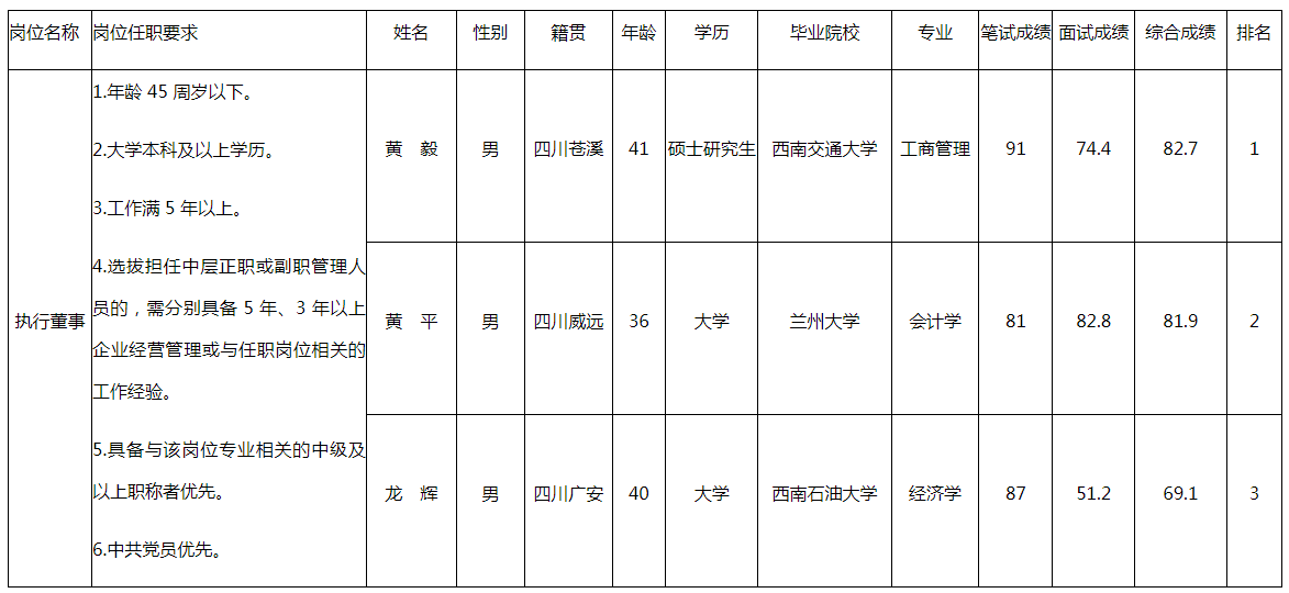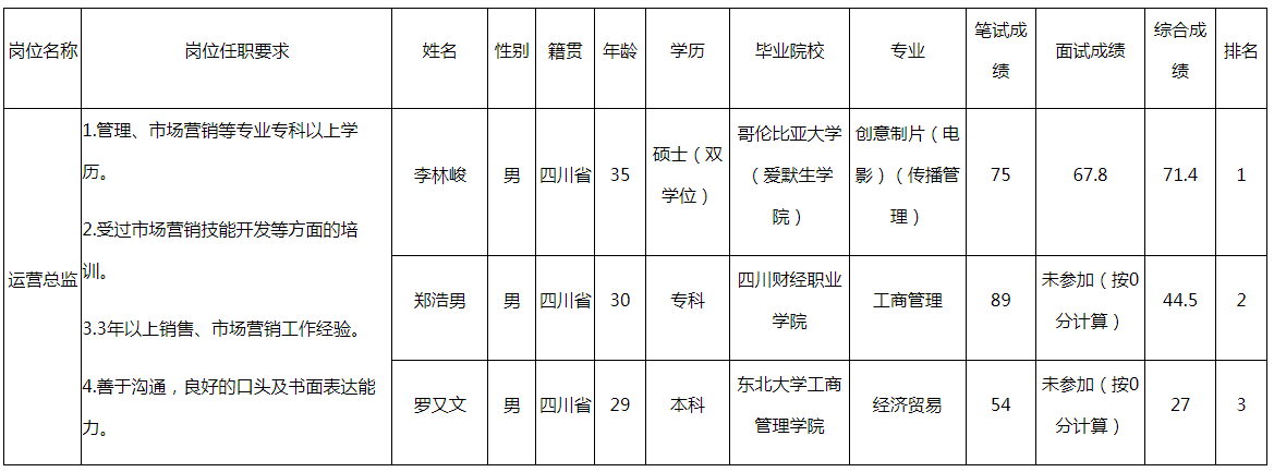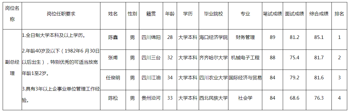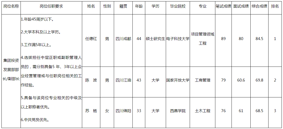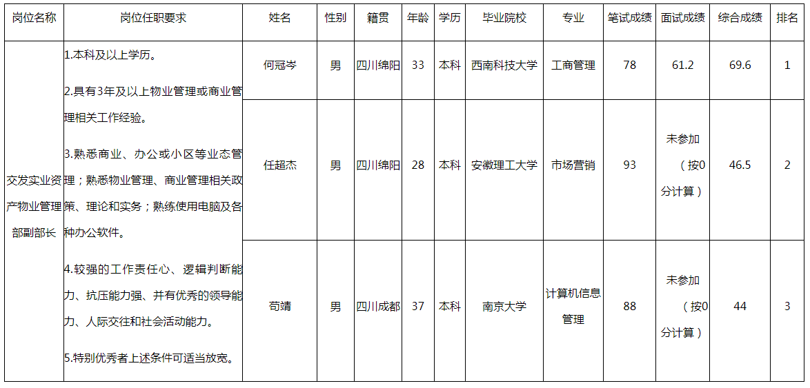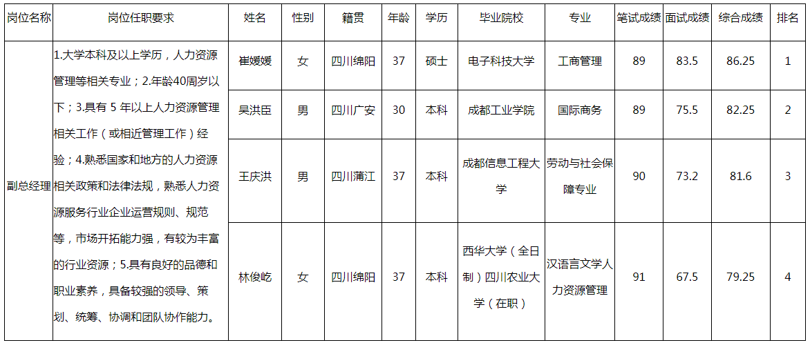 根據(jù)綿陽市國資委發(fā)布的面向全國選聘20名國企經(jīng)營管理人員的公告及相關(guān)規(guī)定,對(duì)11個(gè)達(dá)到開考比例的崗位應(yīng)聘人員組織能力測(cè)試、面試(另有9個(gè)崗位未達(dá)到開考比例終止競(jìng)聘),現(xiàn)將各應(yīng)聘人員成績予以公示。