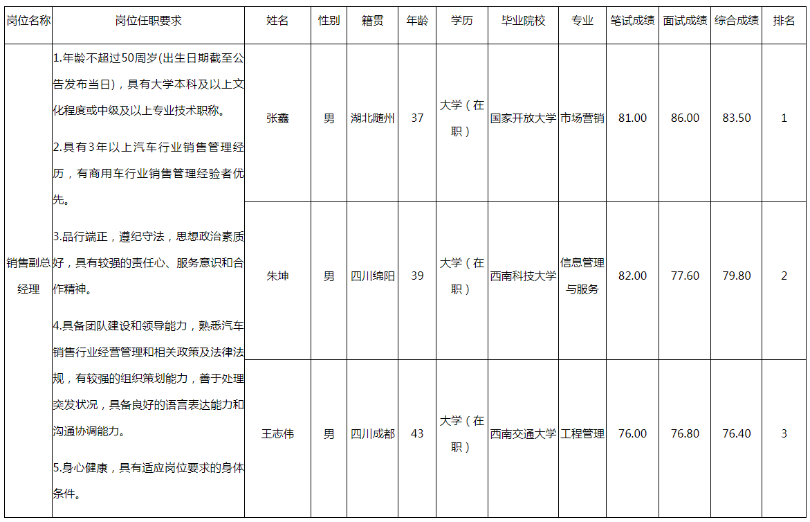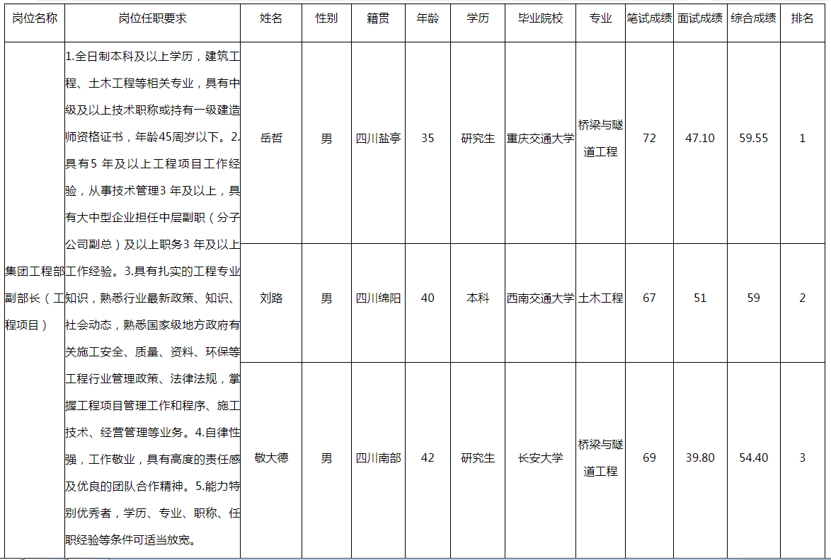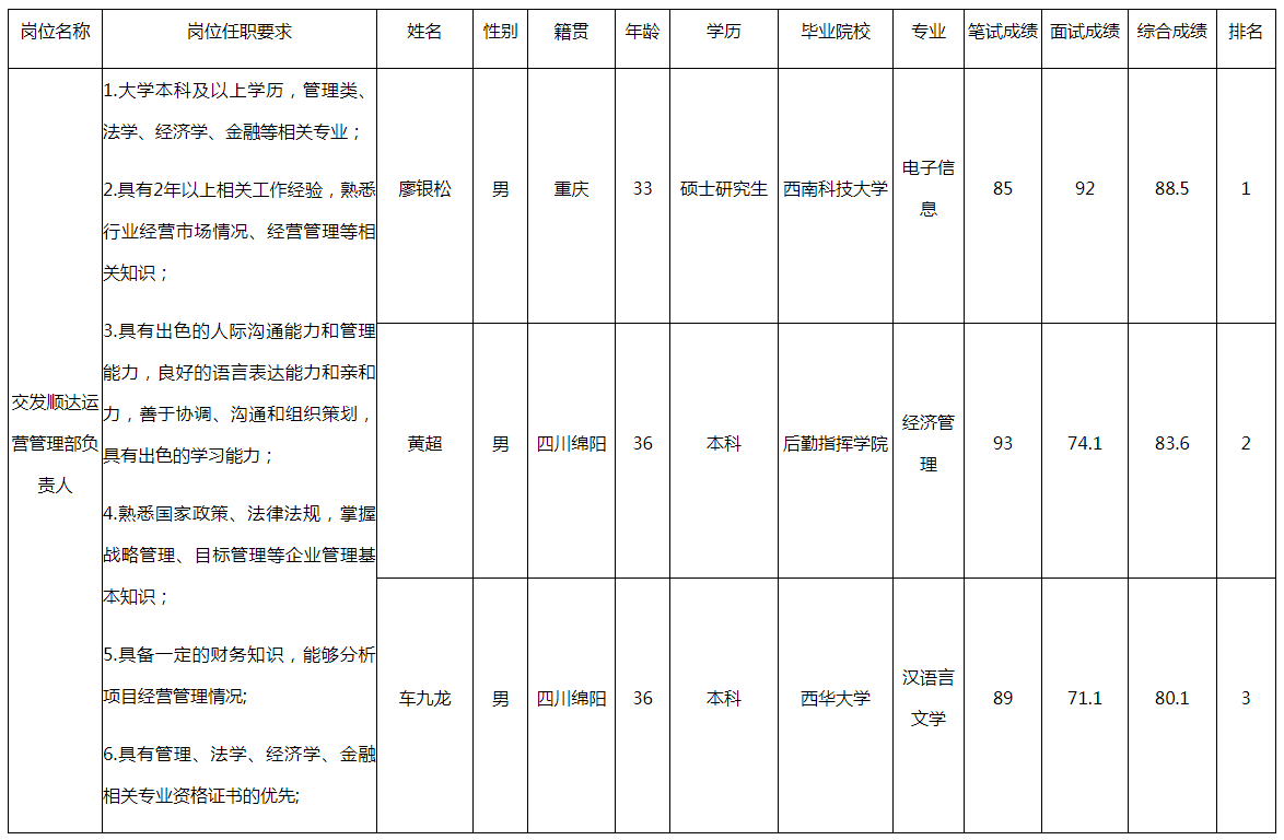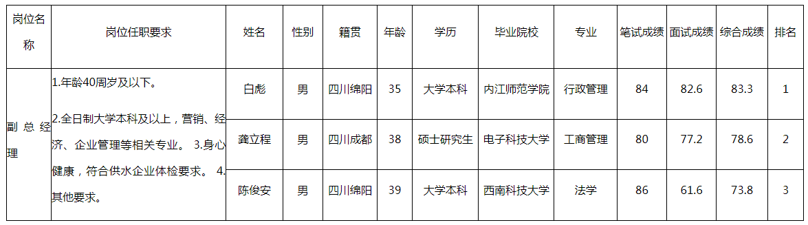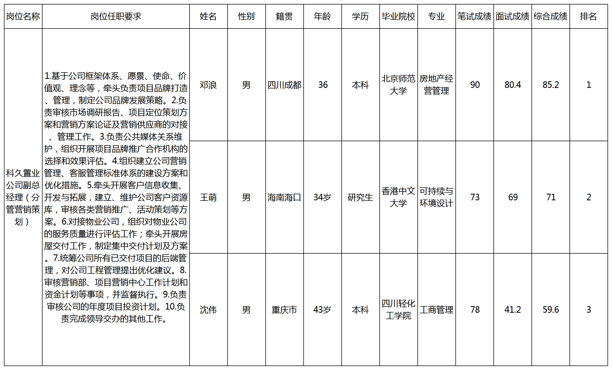 根據(jù)綿陽市國資委發(fā)布的面向全國選聘20名國企經(jīng)營管理人員的公告及相關(guān)規(guī)定,對(duì)11個(gè)達(dá)到開考比例的崗位應(yīng)聘人員組織能力測(cè)試、面試(另有9個(gè)崗位未達(dá)到開考比例終止競(jìng)聘),現(xiàn)將各應(yīng)聘人員成績予以公示。