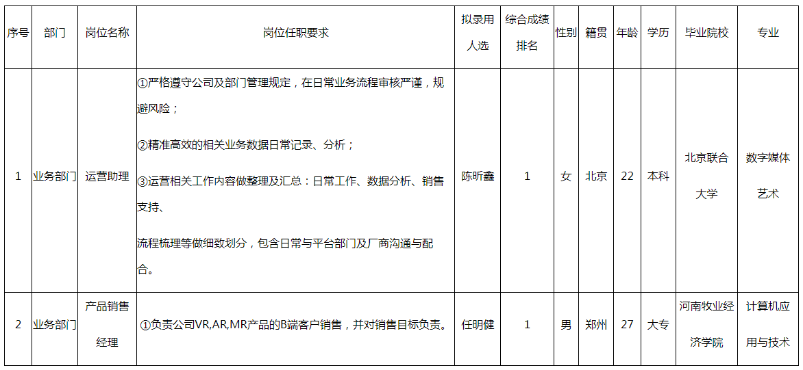 根據(jù)四川長(zhǎng)虹佳華信息產(chǎn)品有限責(zé)任公司發(fā)布的招聘公告及招聘相關(guān)規(guī)定,經(jīng)筆試、面試、考察、體檢等程序,擬錄用陳昕鑫、任明健同志到四川長(zhǎng)虹佳華信息產(chǎn)品有限責(zé)任公司工作,現(xiàn)予以公示,具體情況如下: