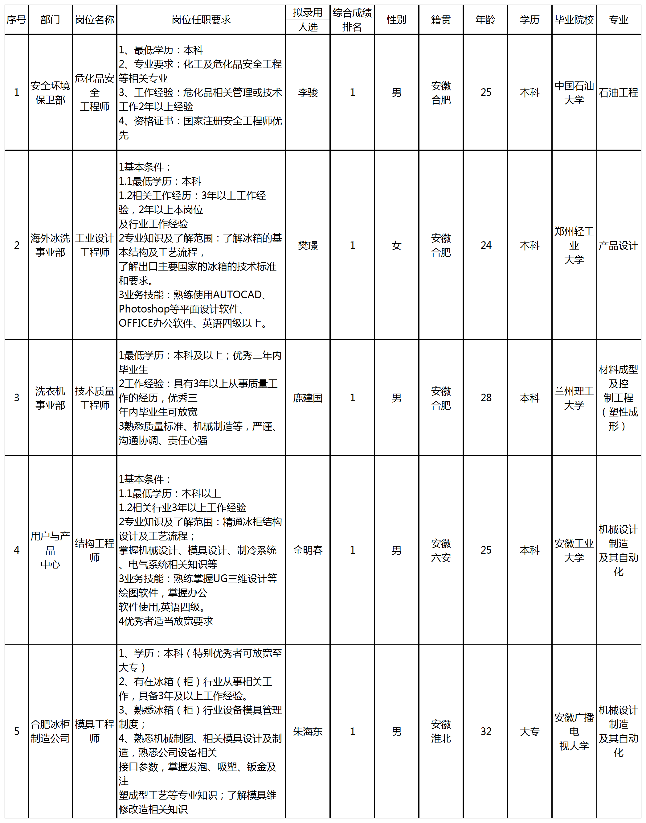 根據(jù)長(zhǎng)虹美菱股份有限公司發(fā)布的招聘公告及招聘相關(guān)規(guī)定,經(jīng)面試、體檢等程序,擬錄用李駿同志到安全環(huán)境保衛(wèi)部等部門工作,現(xiàn)予以公示,具體情況如下: