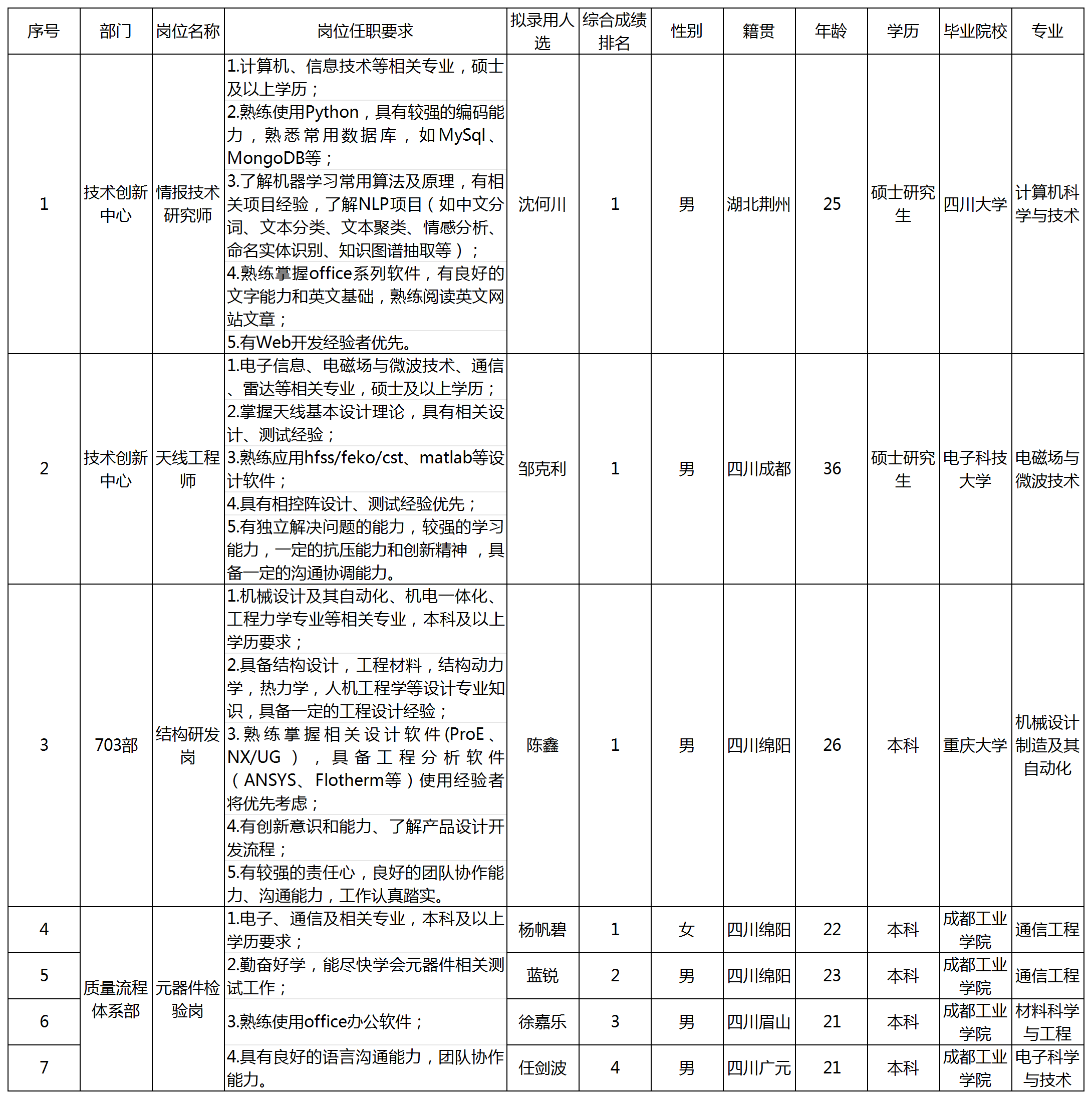 根據(jù)四川九洲電器集團(tuán)有限責(zé)任公司發(fā)布的招聘公告及招聘相關(guān)規(guī)定,經(jīng)筆試、面試、考察、體檢等程序,擬錄用沈何川、鄒克利等7位同志到四川九洲電器集團(tuán)有限責(zé)任公司工作,現(xiàn)予以公示,具體情況如下: