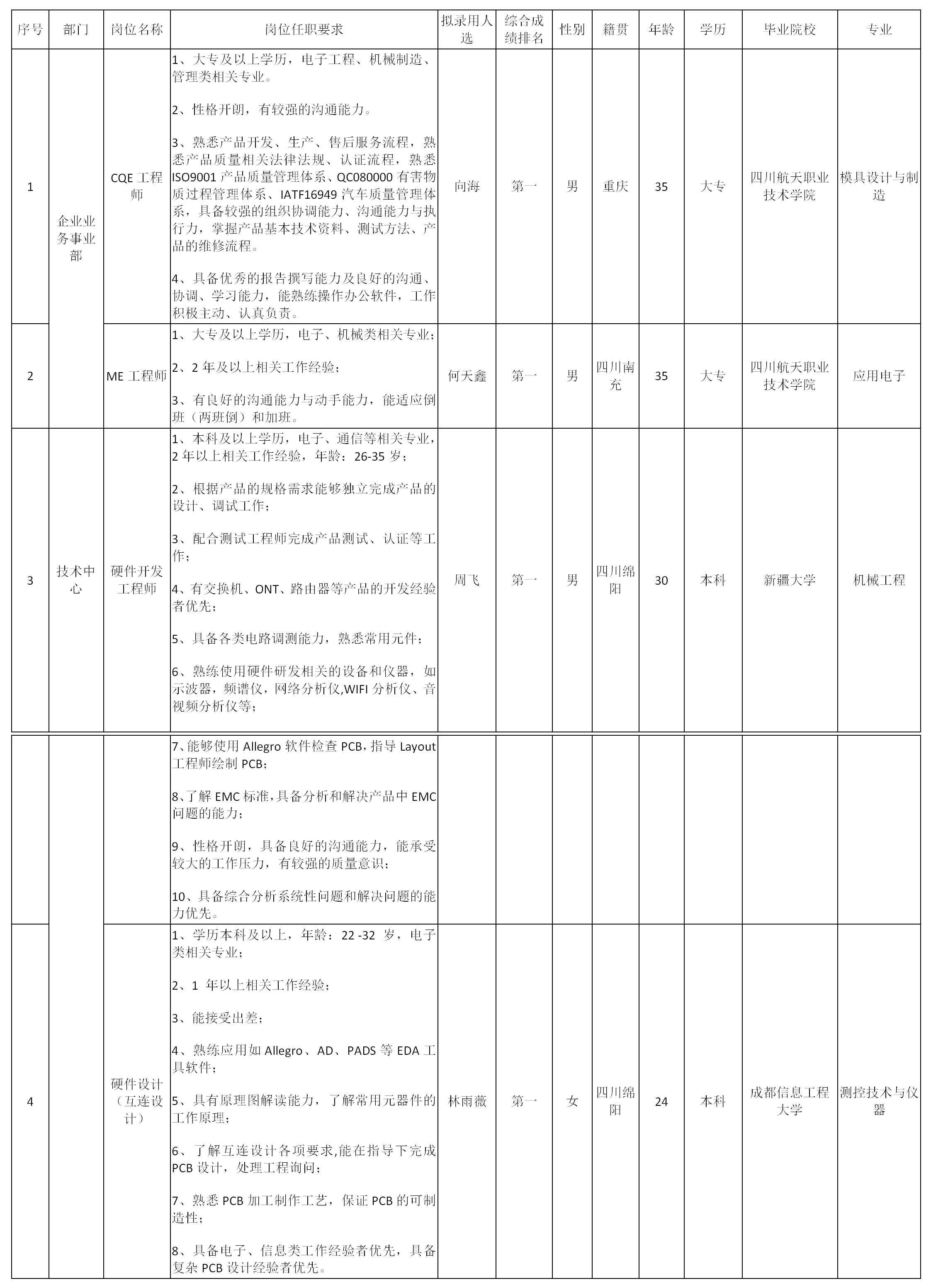 根據(jù)四川九州電子科技股份有限公司發(fā)布的招聘公告及招聘相關規(guī)定,經筆試、面試、考察、體檢等程序,擬錄用向海等4名同志到四川九州電子科技股份有限公司工作,現(xiàn)予以公示,具體情況如下: