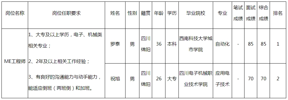根據(jù)四川九州電子科技股份有限公司發(fā)布的招聘公告及招聘相關(guān)規(guī)定,經(jīng)筆試、面試等程序,現(xiàn)將筆試(面試)成績予以公示。
