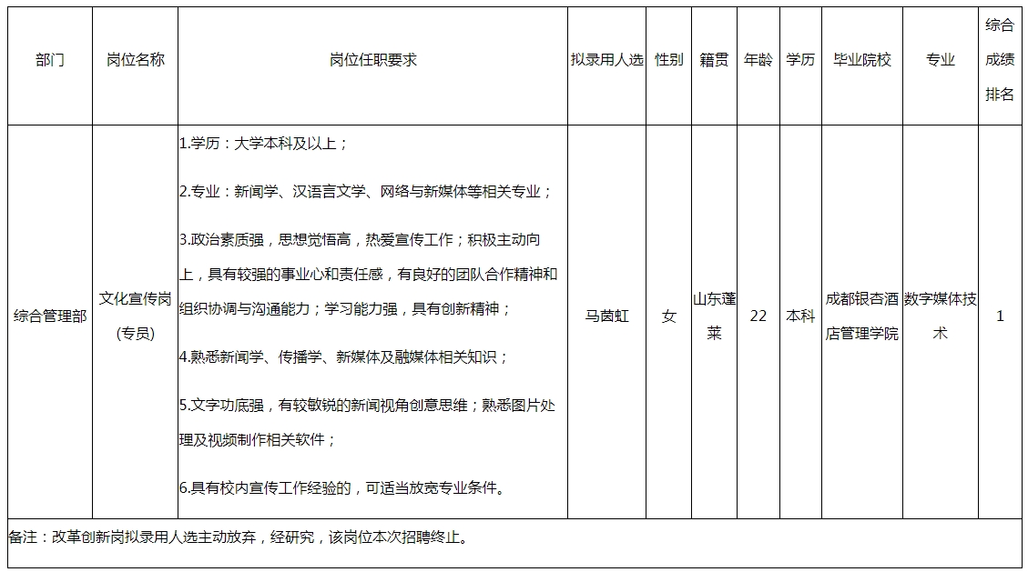 根據(jù)綿陽交通發(fā)展集團有限責任公司發(fā)布招聘公告及招聘相關(guān)規(guī)定,經(jīng)面試、考察、體檢等程序,擬錄用馬茵虹同志到綿陽交通發(fā)展集團有限責任公司工作,現(xiàn)予以公示,具體情況如下: