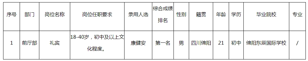 根據(jù)綿陽市綿州嘉來會(huì)務(wù)服務(wù)有限公司發(fā)布的招聘公告及招聘相關(guān)規(guī)定,經(jīng)面試、體檢等程序,錄用以下人員到綿陽市綿州嘉來會(huì)務(wù)服務(wù)有限公司工作,現(xiàn)予以公示,具體情況如下: