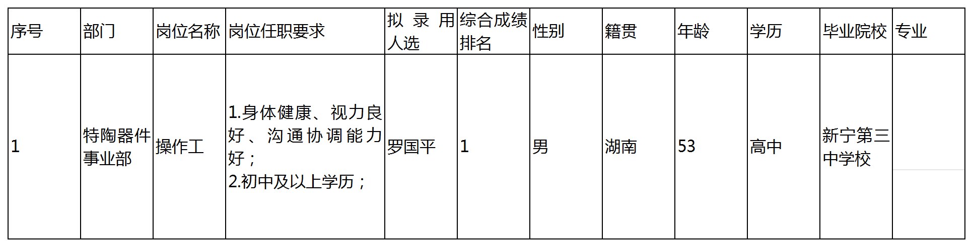 根據(jù)宜賓紅星電子有限公司發(fā)布的招聘公告及招聘相關(guān)規(guī)定,經(jīng)面試、體檢程序,擬錄用羅國平同志到宜賓紅星電子有限公司工作,現(xiàn)予以公示,具體情況如下: