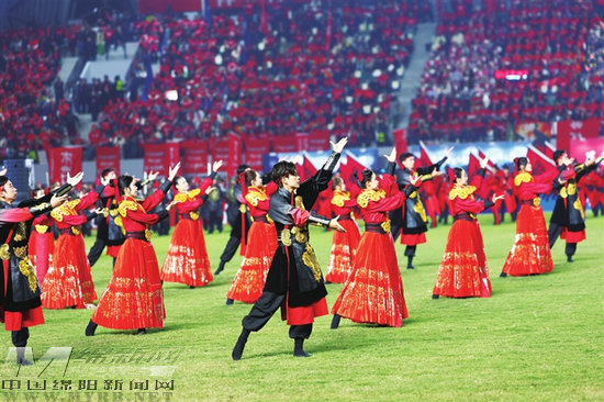從開(kāi)場(chǎng)表演《郪風(fēng)唐韻》,“鳳凰于飛”燈光秀光影流轉(zhuǎn),鳳翼翩然,到充滿(mǎn)青春氣息的團(tuán)體操,兩地文化符號(hào)輪番上演,將古風(fēng)古韻與團(tuán)結(jié)熱烈的氛圍拉滿(mǎn)。