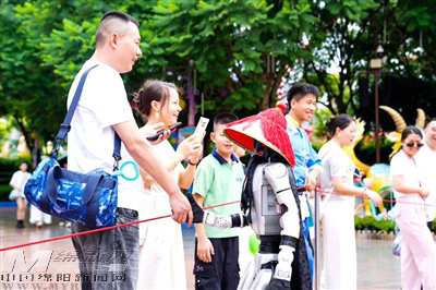 當(dāng)天上午10點,園區(qū)入口已排起長隊。步入清韻小鎮(zhèn),數(shù)臺人形機器人化身“機械俠客”,身披斗笠、手持古風(fēng)兵器,一招一式盡顯武俠風(fēng)骨。游客們紛紛駐足,孩子們興奮地模仿動作,年輕人則舉起手機記錄這新奇一幕。