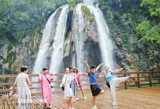 游客近距離感受瀑布清涼