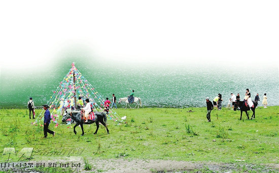 游客在白馬天母湖畔悠閑騎馬
