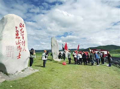 紀(jì)念碑后的日干喬大沼澤,是這段歷史中不可磨滅的坐標(biāo)。1936年7月底,紅二、四方面軍左路縱隊(duì)從阿壩出發(fā),經(jīng)紅原瓦切鎮(zhèn)格央附近渡過嘎曲河后,踏入這片被稱為“死亡之海”的沼澤。隨后,一堂以《信念堅(jiān)如磐鐵心跟黨走——半截皮帶的長征記憶》為主題的微黨課,喚起大家對(duì)艱苦歲月和堅(jiān)定信仰的集體記憶。“這次帶孩子參加這個(gè)活動(dòng),就是為了讓她能親身了解這段歷史,感受長征的艱辛,幫助她更好的成長。”綿陽市民尤庭海說。