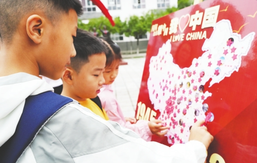 “我愛中國——閃閃紅星耀中國”主題展板被圍得水泄不通,孩子們在老師的指導(dǎo)下,把假期親手制作的小紅星貼到中國地圖上,一顆接一顆,最終匯聚成一幅“閃閃紅星耀中國”的壯麗畫卷,每一顆小紅星都閃耀著光芒,蘊(yùn)含著孩子們對祖國深沉而熾熱的愛。
