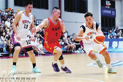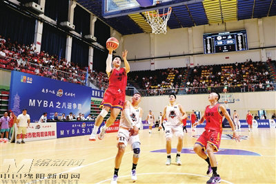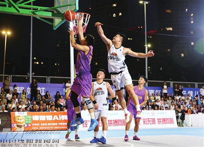 涪城鐵牛隊(duì)與高新先鋒隊(duì)精彩對(duì)決中,先鋒隊(duì)隊(duì)員帶球上籃。