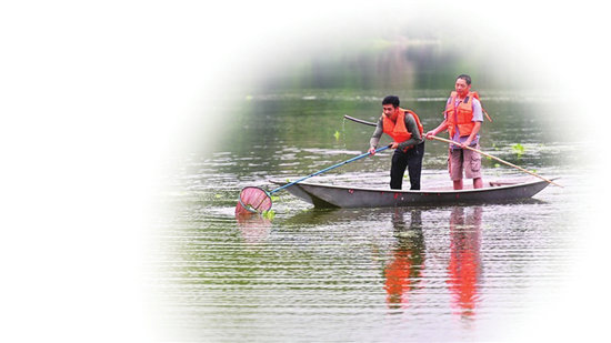 眉山天府新區(qū)北斗鎮(zhèn)石河村的志愿者打撈河面漂浮物。 彭雅靈 攝