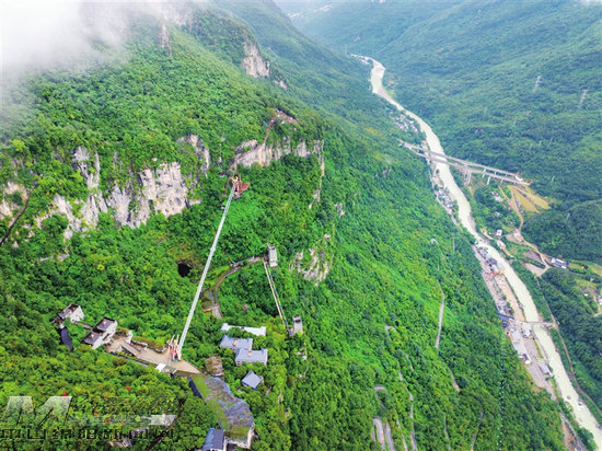 在北川九皇山景區(qū),高空玻璃橋、云中情人橋與九綿高速隧道連接橋同框。 新華社記者 江宏景 攝