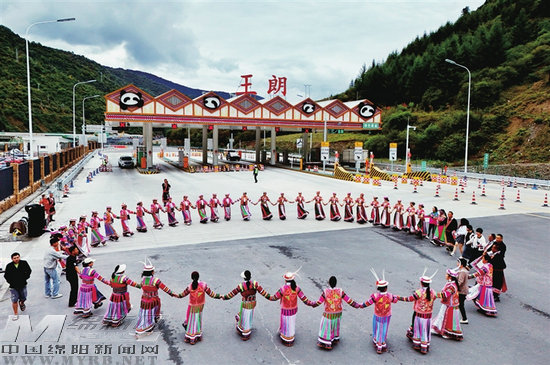 在九綿高速王朗出口,平武縣白馬藏族鄉(xiāng)群眾載歌載舞,慶祝九綿高速全線通車。 胡宇 攝